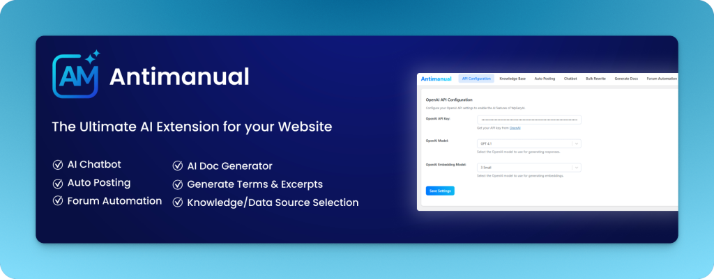 Download Antimanual from the WordPress repository now. With just a few steps, you’ll have a powerful AI assistant ready to serve your users. Give it a try—your site.
