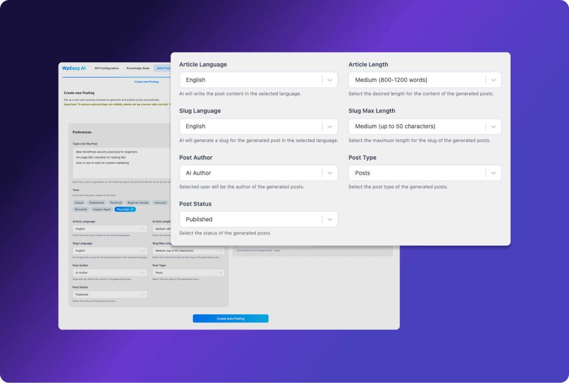 Customize every part of your generated posts—from language and length to author, slug style, and post status. These detailed controls help you publish content exactly the way you want, keeping your workflow organized and consistent.