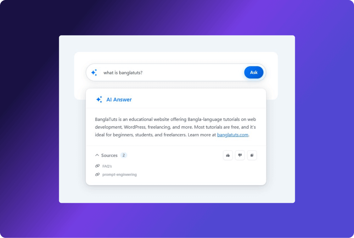 AI Search is a smart, customizable search block that lets users ask anything and receive AI-powered results with source links, offering a seamless, interactive experience for AI search post.