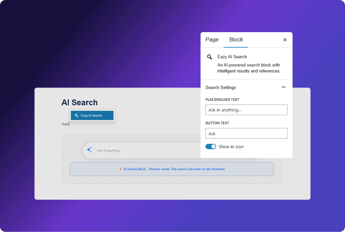 This image showcases the Eazy AI Search block, allowing users to customize placeholder text, button labels, and AI icons. It provides an intuitive interface for creating an AI-powered search experience directly inside WordPress pages with flexible settings.