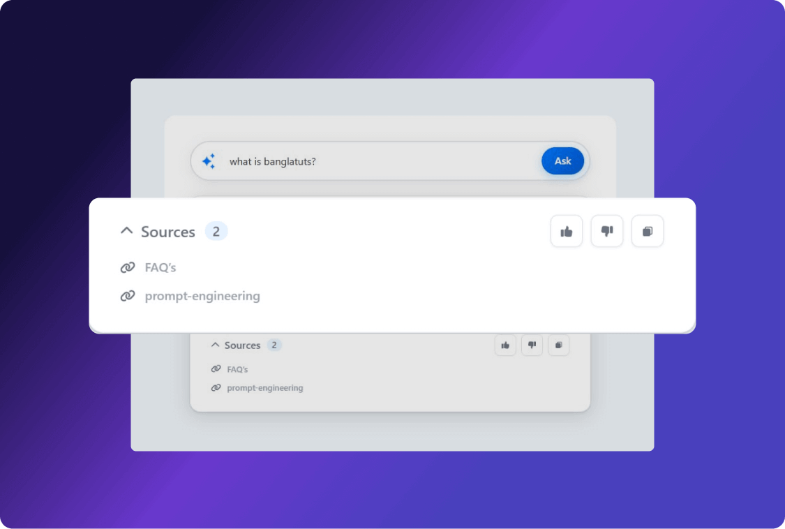 This interface delivers trustworthy answers by combining AI summaries with direct source citations. It ensures transparency by linking users to relevant internal content, allowing them to verify information and explore details with confidence and ease.