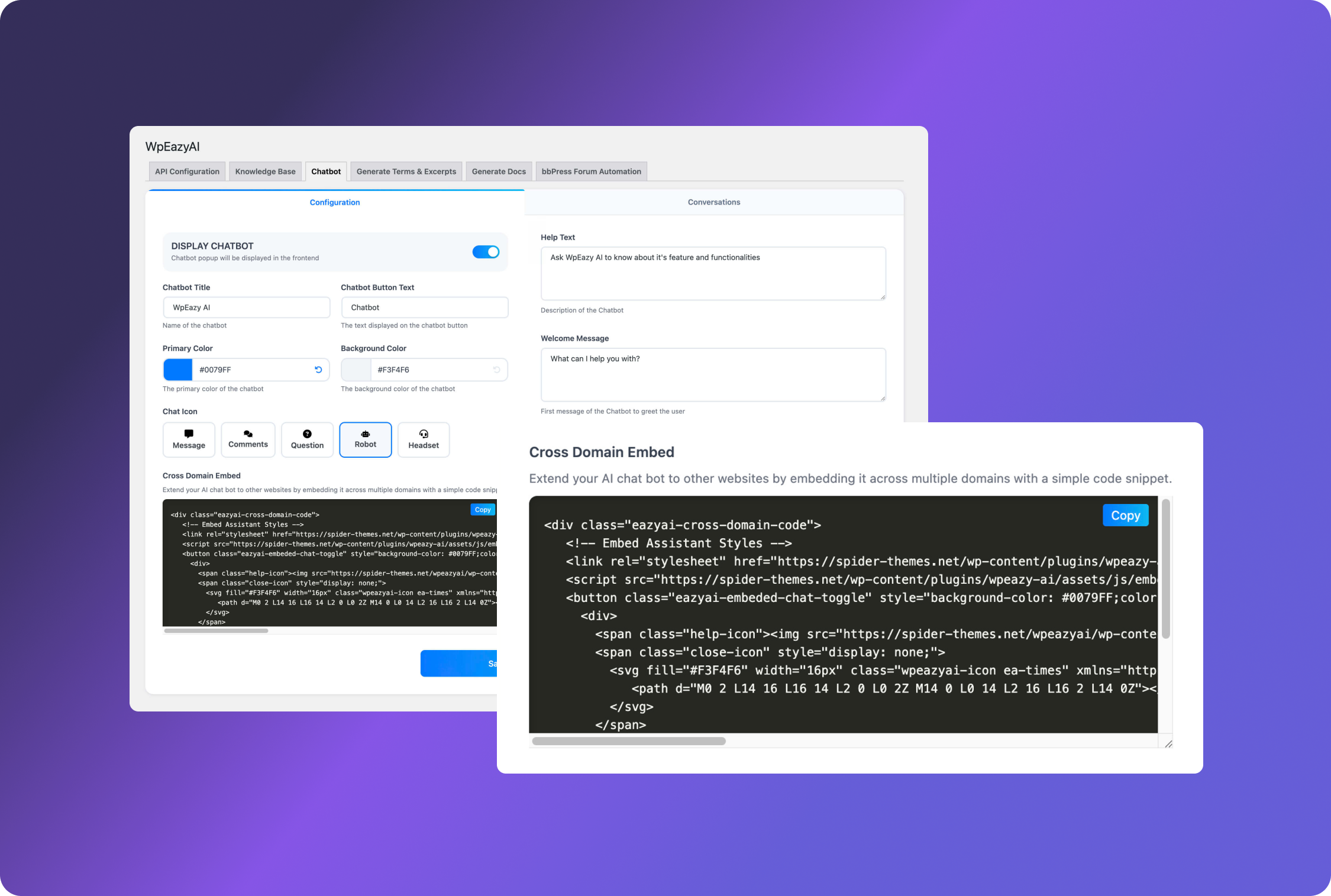 Easily customize your chatbotโs appearance with colors, icons, and styles to match your WordPress brand, ensuring a cohesive design, enhanced user experience, and a visually appealing, professional interface for every visitor.