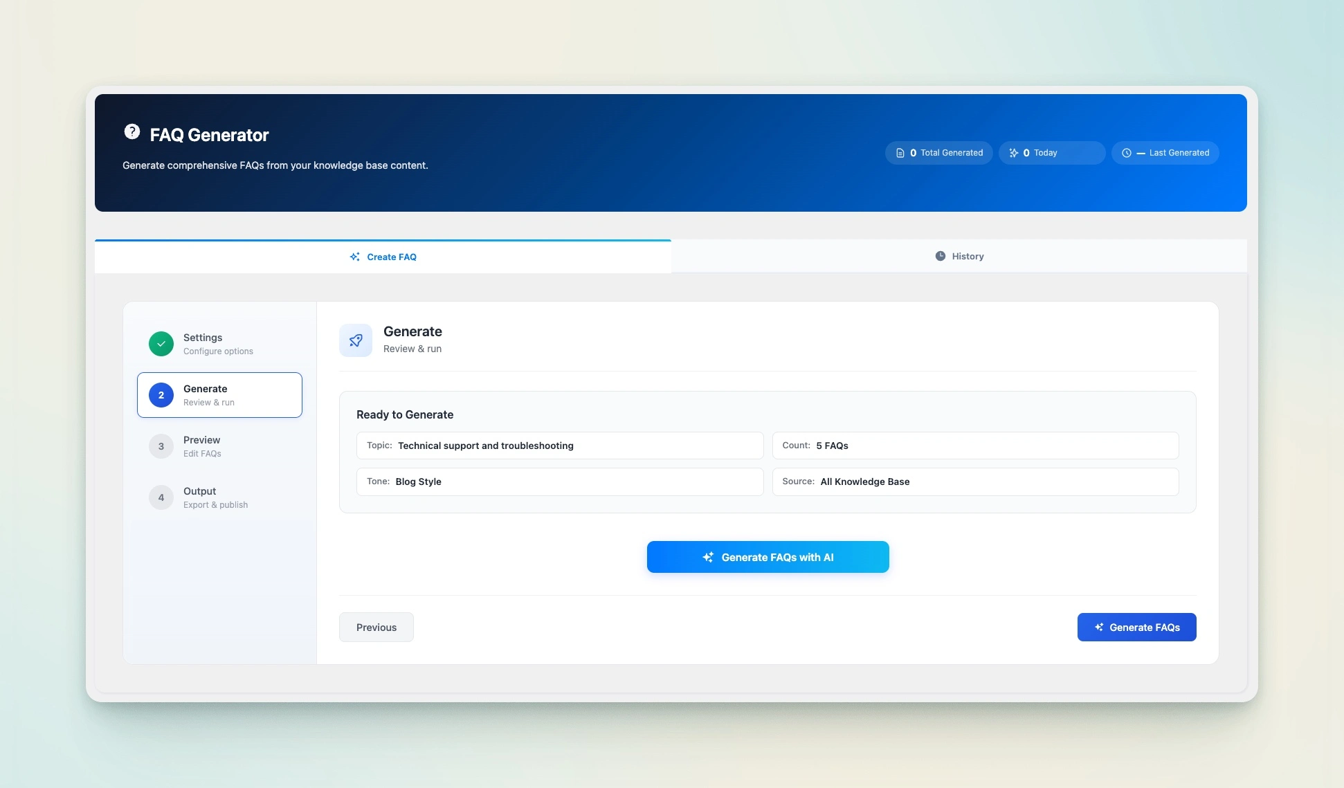 Generate smart FAQs with AI using topic presets, tone control, and flexible content sources.
