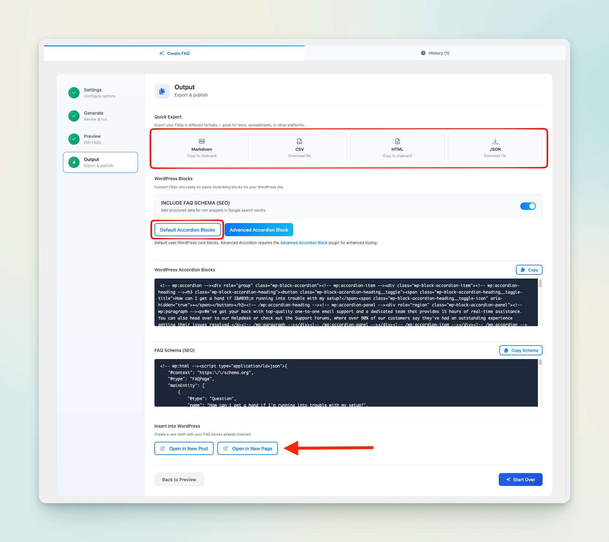 Export FAQs in Markdown, CSV, HTML, or JSON formats to fit your workflow. Convert them into WordPress accordion blocks, add FAQ schema for SEO, or open everything directly in a new draft post instantly.