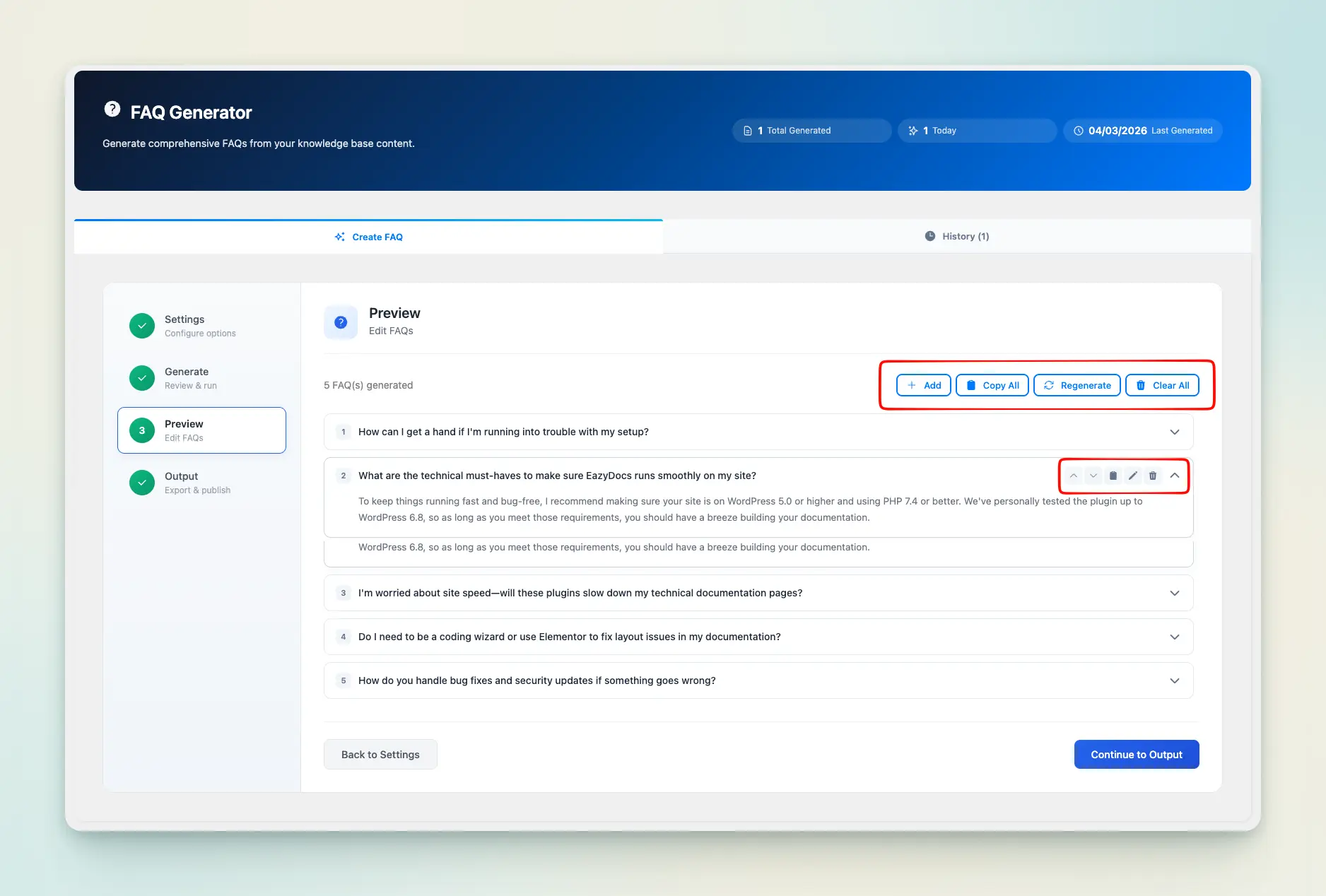 Edit questions and answers inline, reorder entries, delete unwanted items, or add custom FAQs manually. Copy individual entries or the full set instantly, with automatic local saving to protect your generated content.