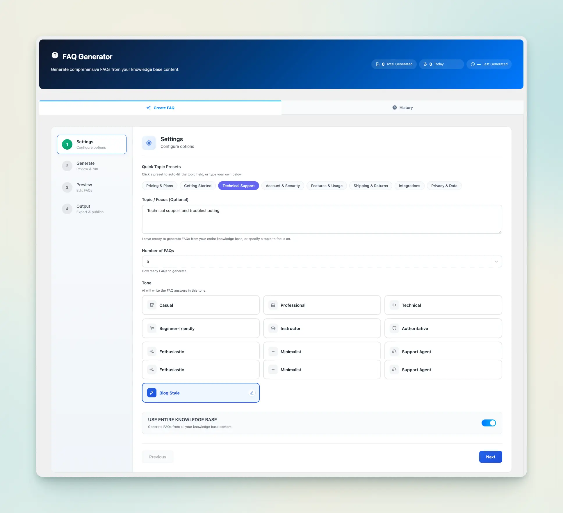 Control how your FAQs are generated with flexible options. Choose topic presets or set a custom focus, define the number of FAQs, select tone, and decide whether to use the full knowledge base or specific sources.