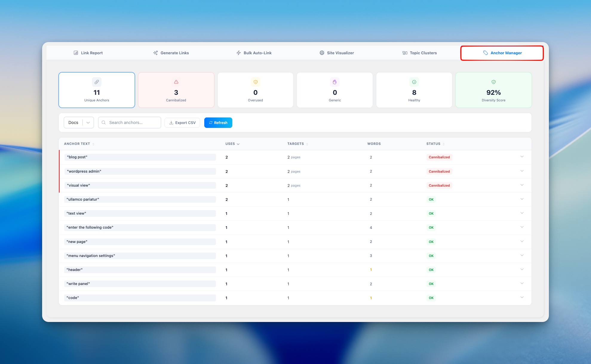 Inventory all anchor texts, detect overused or generic anchors, and prevent cannibalization. Monitor diversity scores and expand audit trails to see source and target URLs. Export CSVs for offline optimization, ensuring balanced, effective, and SEO-friendly anchor usage.