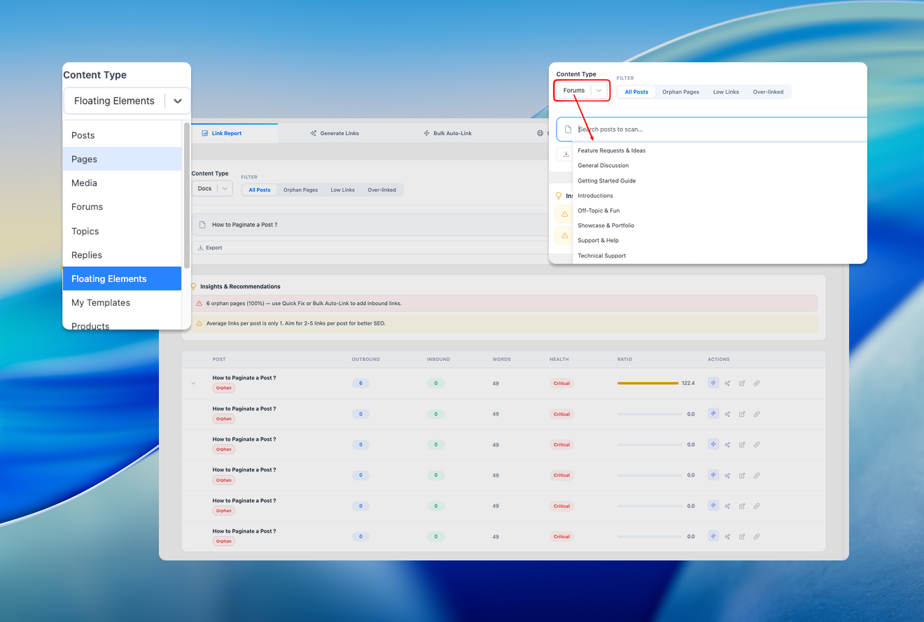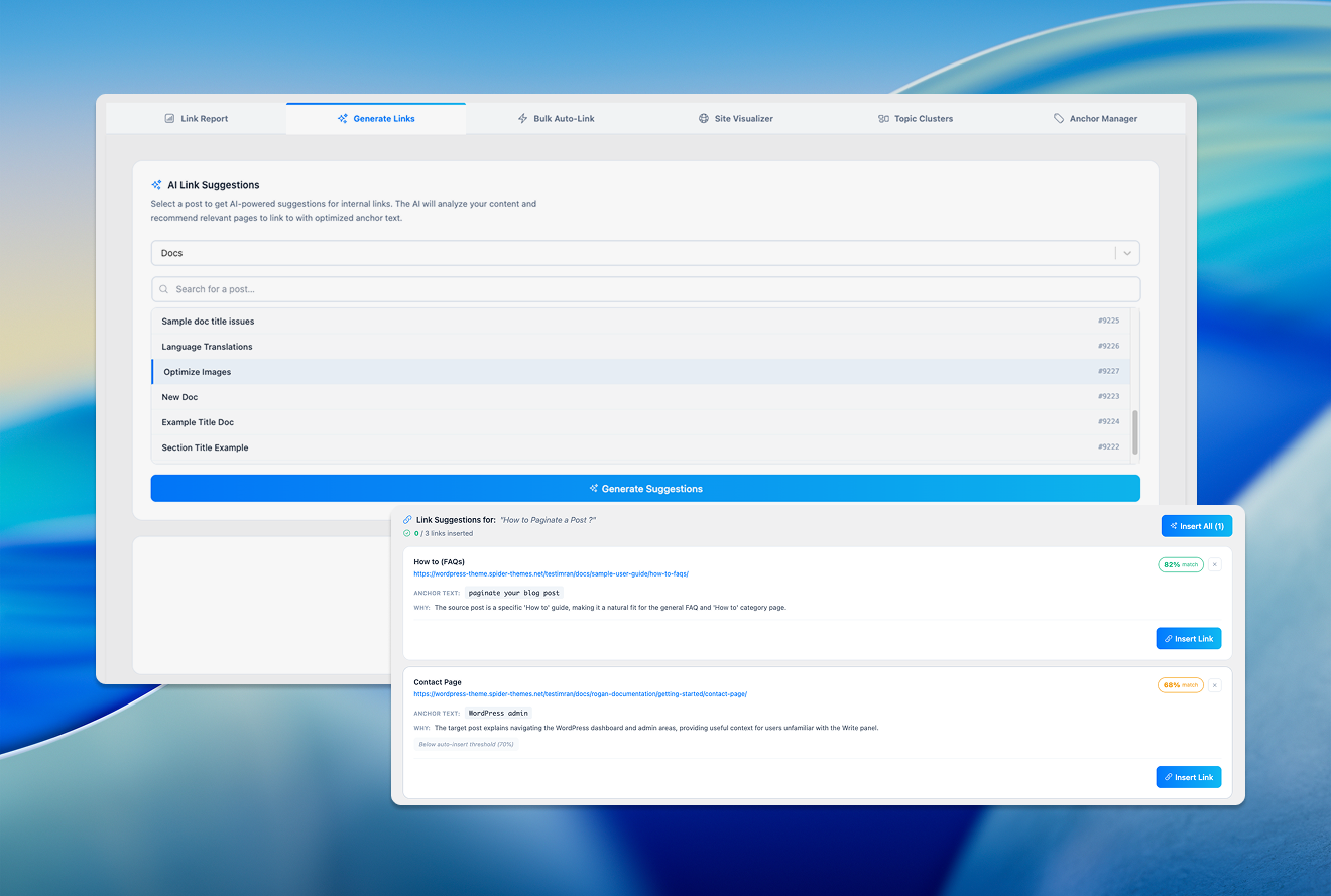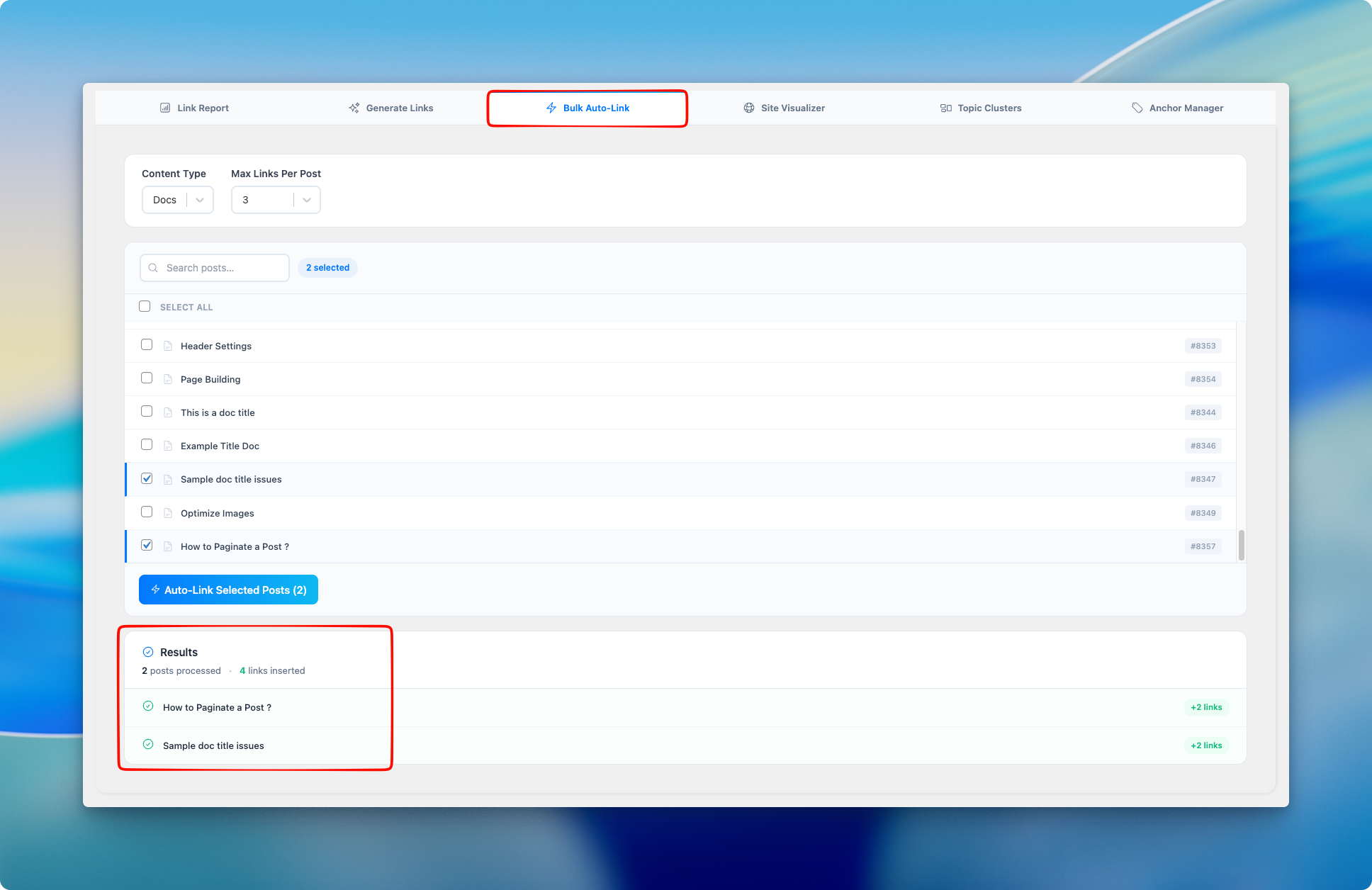 Automate internal linking across multiple posts simultaneously. Select up to 50 pages, configure link limits, and track real-time progress. Receive detailed summaries of inserted links, skipped posts, or errors, saving time while strengthening your site’s internal structure.