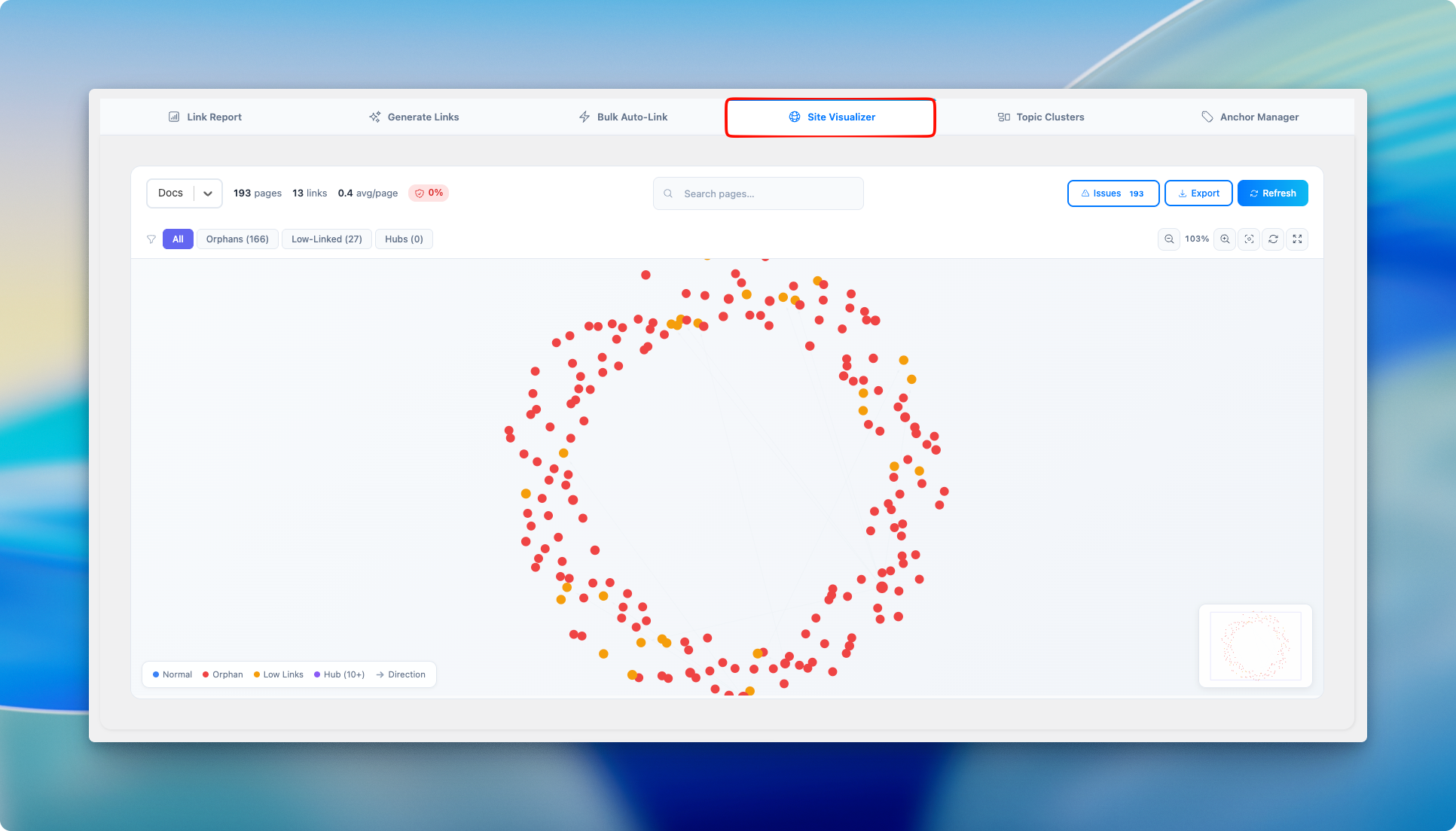 Visualize your website’s internal links through an interactive, force-directed graph. Color-coded nodes highlight orphans, hubs, and low-link pages. Search, zoom, focus, and export CSV data to map connections, optimize link structure, and improve navigation effortlessly.