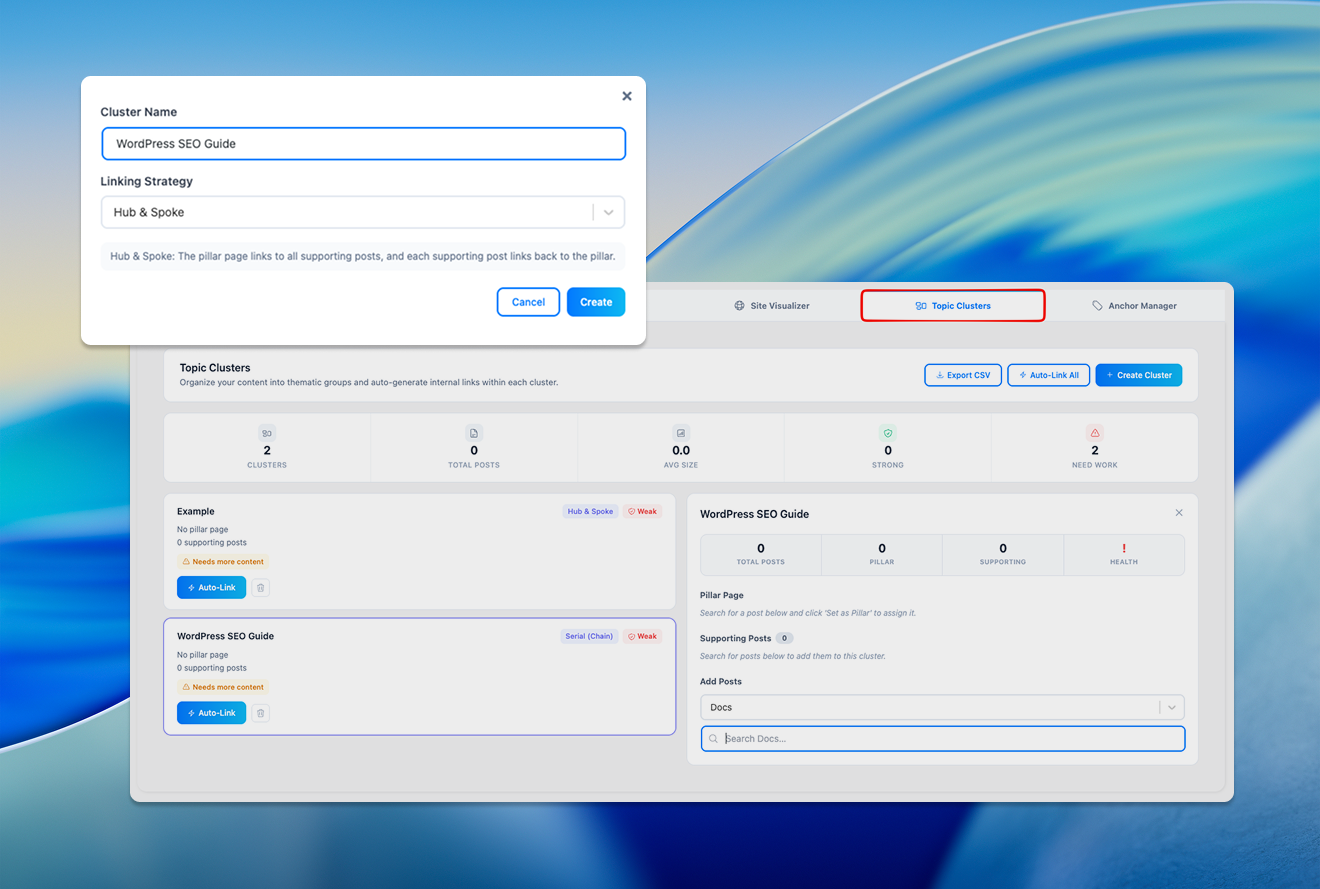 Organize content into thematic silos with pillar pages and supporting posts. Choose linking strategies like Hub & Spoke, Serial, or Circle. Auto-link posts, check cluster health, detect duplicates, and export CSV reports to build strong topical authority for SEO.