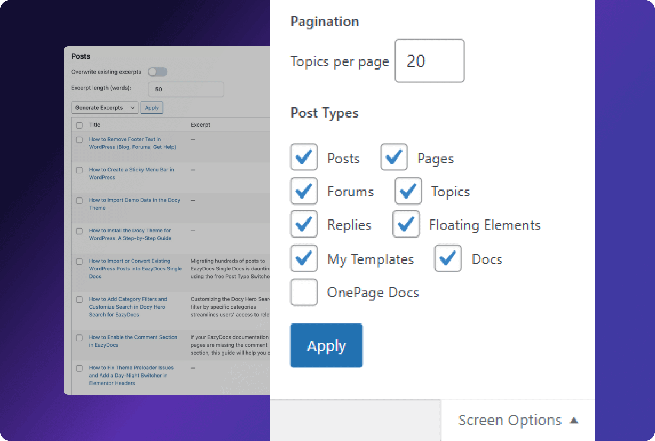 Adjust the Topics per page setting to about 20 to streamline bulk management. set custom excerpt lengths, and generate summaries efficiently. By batching operations, you save time and reduce the need to scroll through large amounts of content.
